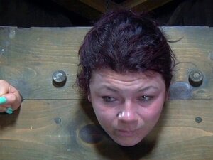 Hot lesbian slave Lia Lor is bound in wooden stocks down on the hard wooden floor and then gets candle waxed and caned by lezdom Claire Adams on device bondage dungeon