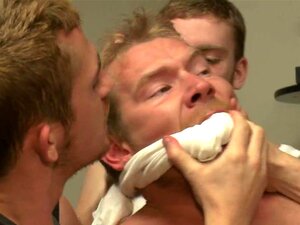 Edging a hot cop in a public restroom, Mike Gaite stumbles upon Van and Sebastian cruising in the bathroom. He handcuffs both pervs. They quickly overtake him, tape his mouth shut and bind his arms behind his back. Van holds him still as Sebastian sucks hi