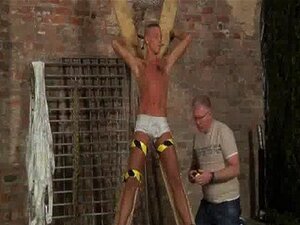 Sexy gay He' s trussed up to the cross in just his underwear when the